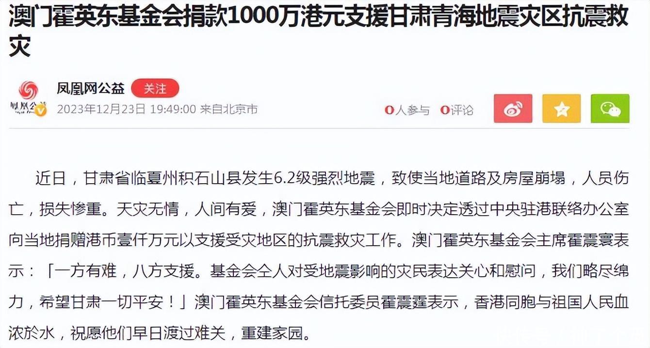 连合另一则新闻,事情就很明了:12月23日,澳门霍英东基金会透过中联办向当地捐赠港币1000万元支持抗震救灾。