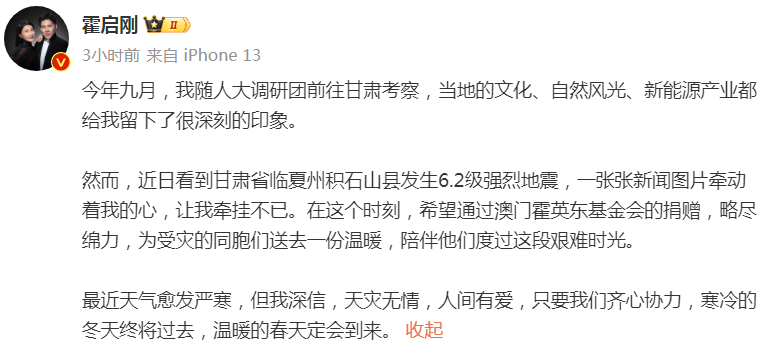 12月23日,网传霍启刚郭晶晶浑家为甘肃灾地捐钱7000万元。尽管讯息开首并不严谨,但就这么上了热搜。